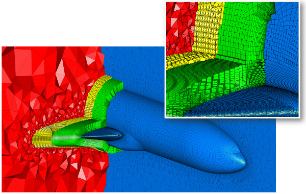 (inset image shows partitions filled with high quality hybrid mesh at the wing-fuselage junction)